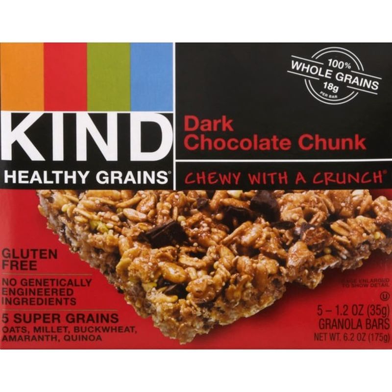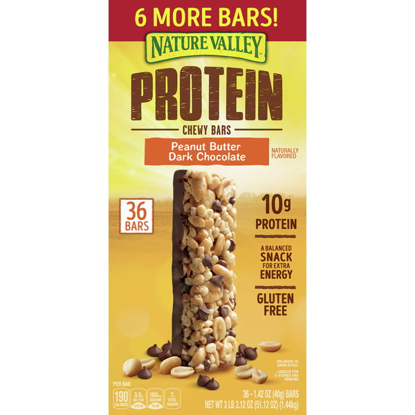 Nature valley granola bars are made with whole grain oats, roasted peanuts, and dark chocolate chunk.