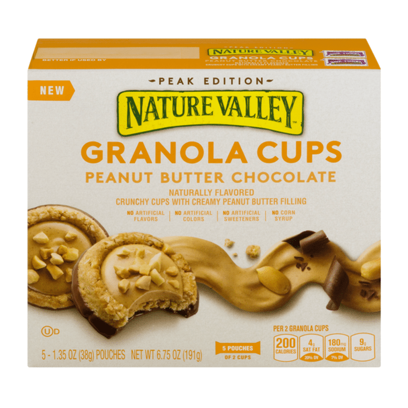 Crunchy cups with creamy filling. Nature valley introduces peanut butter chocolate granola cup. These come in almond butter double chocolate, peanut butter chocolate and almond butter. The perfect snack for any hiking trail!