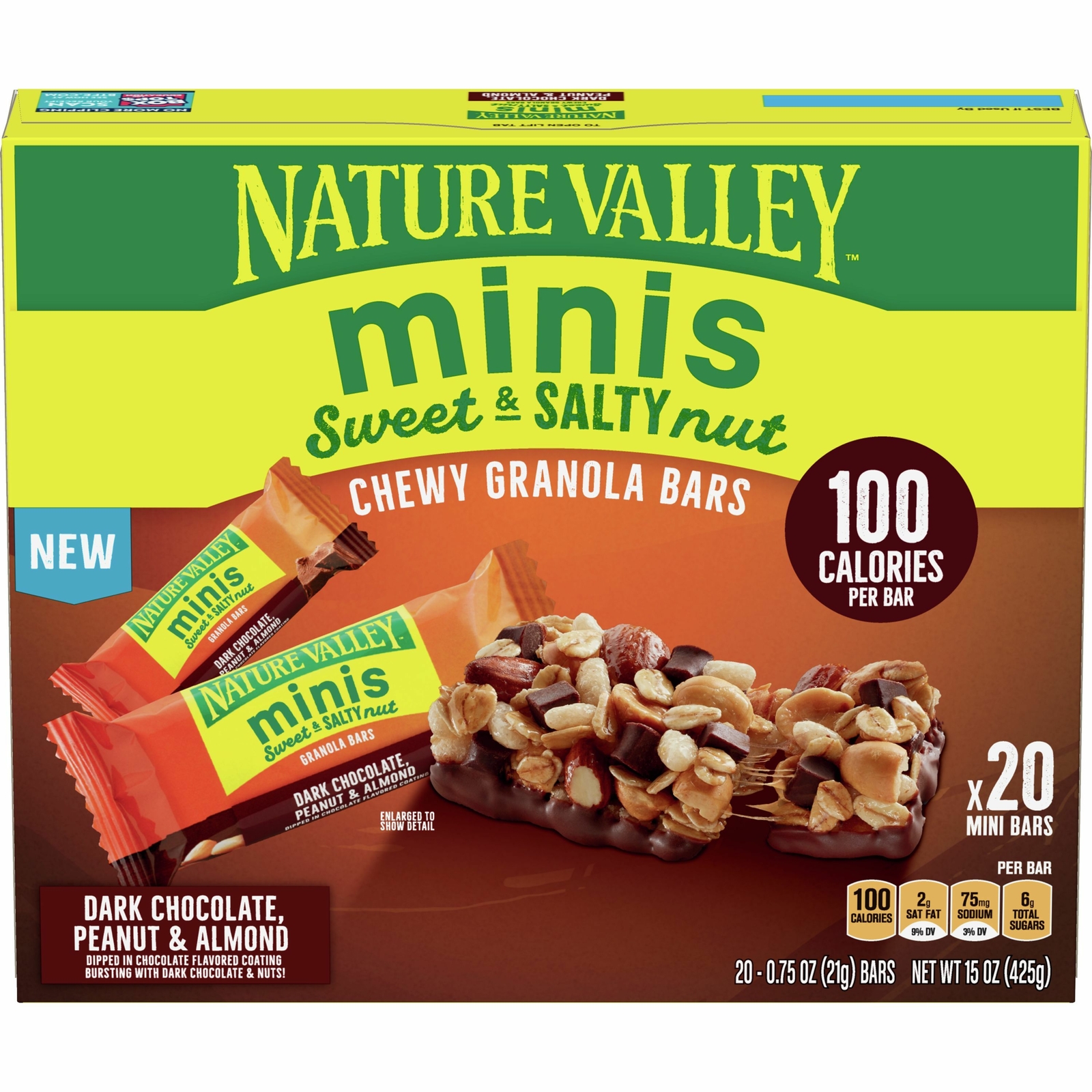 View Nature Valley Granola Bars Sweet And Salty Nut Dark Chocolate Peanut & Almond US. Nature valley sweet and salty dark chocolate, peanut and almond bars are a perfect balance of chewy granola and delicious real peanuts and almonds, bursting with dark chocolate and nuts, dipped in a peanut butter coating. Maltodextrin, cocoa mass, almond pieces (4%), fructose, fat reduced cocoa powder, rice flour.
